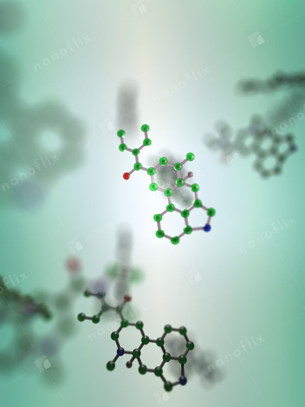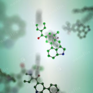 - Serotonin (a neurotransmitter) presented as ball-and-stick model. Its biological function is modulating mood, cognition, reward, learning, memory, etc.