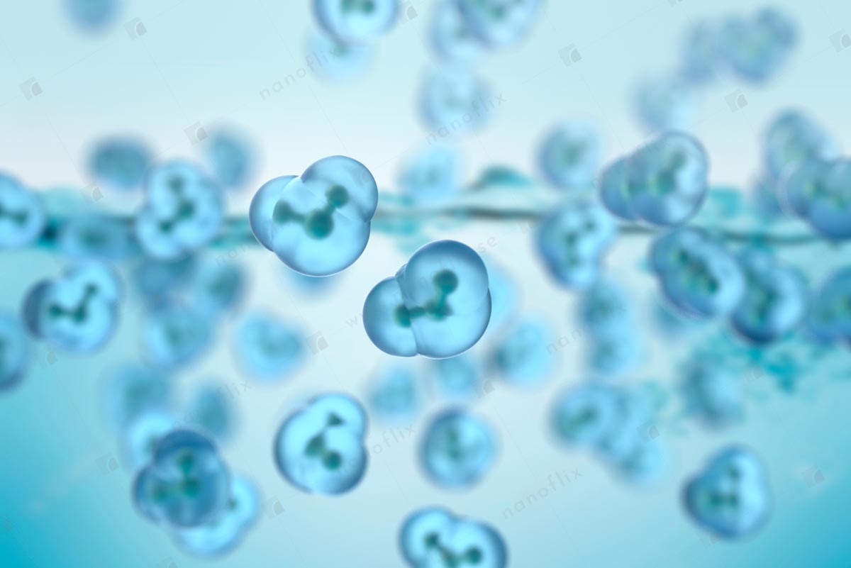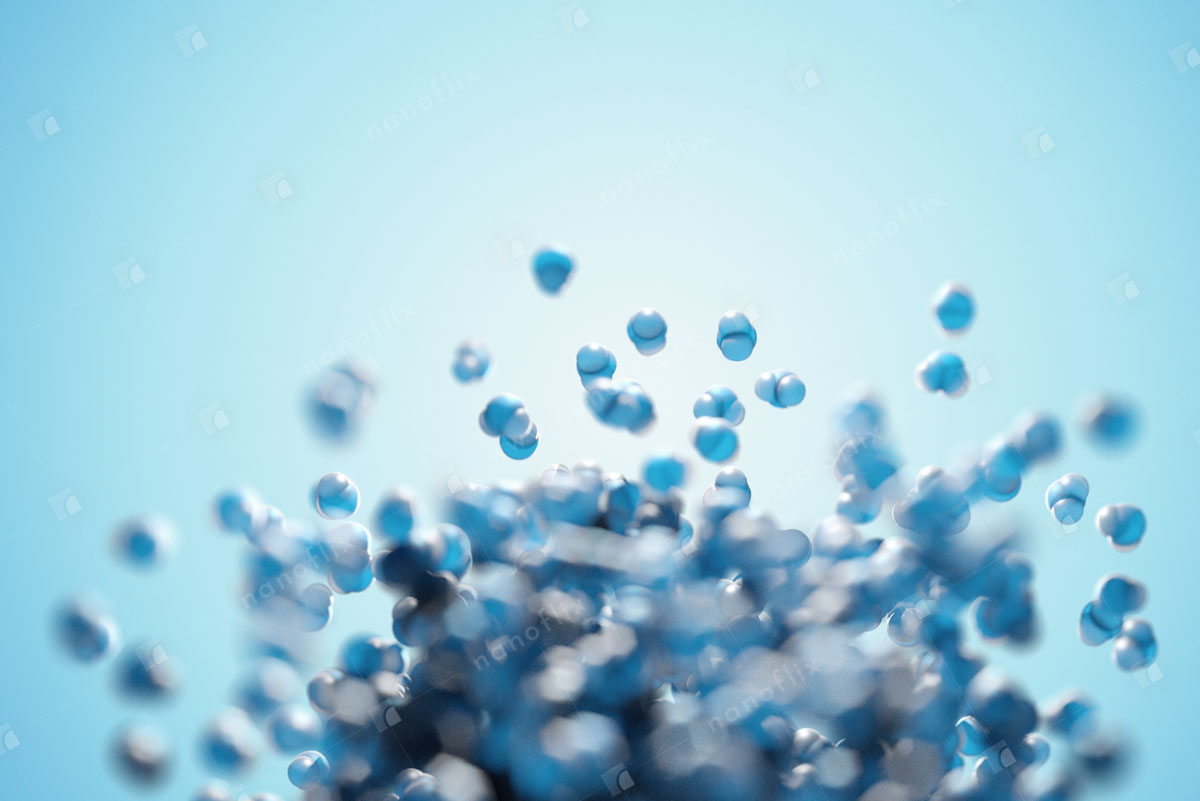- Water molecules. Each water molecule consits of two hydrogen atoms bound to one oxygen atom.