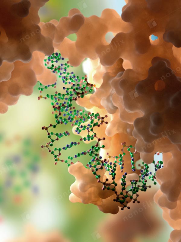 - DNA and protein interaction at molecular level. DNA-binding proteins control transcription, gene expression etc.