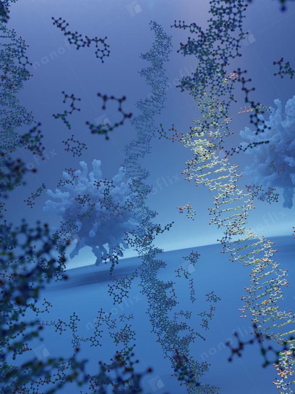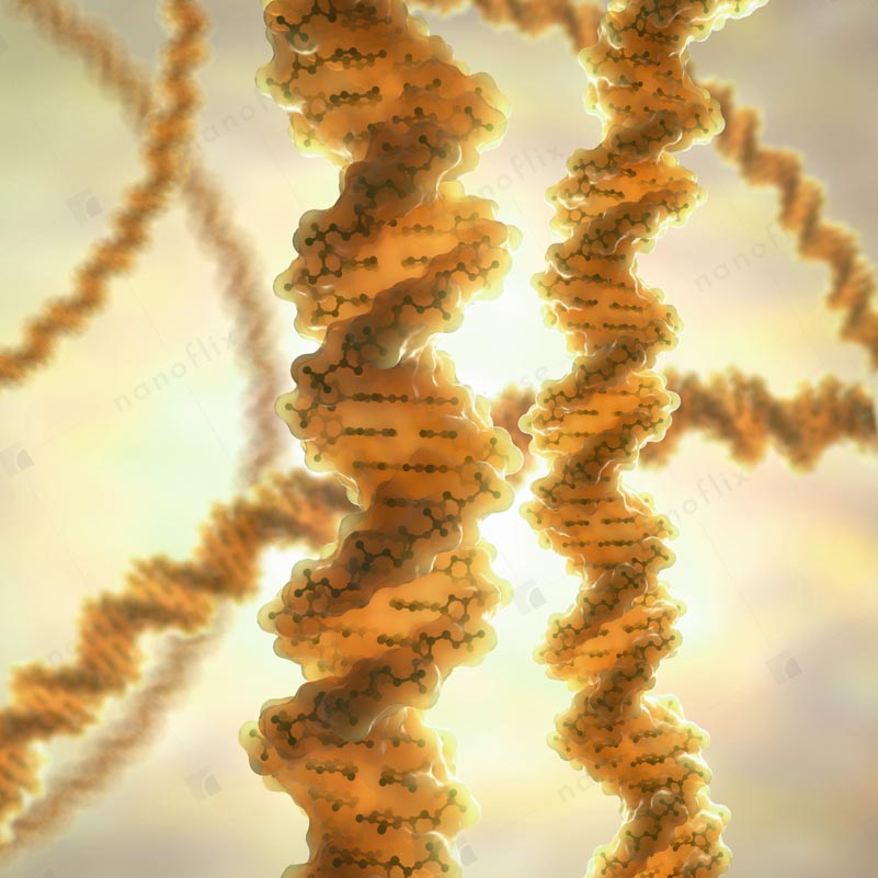 - DNA chains. Scientifically correct representation of the DNA molecule. Long chains of DNA, carrying the genetic code, resides in the nucleus of the cell.