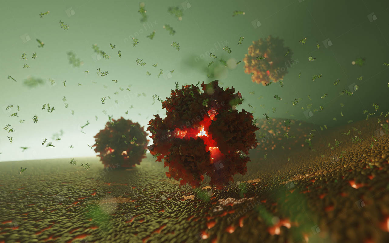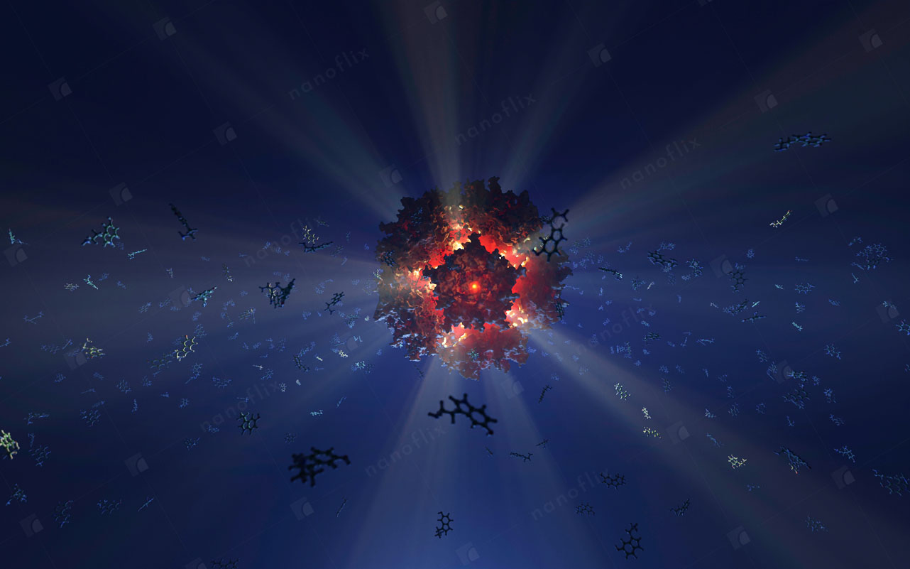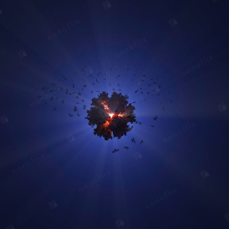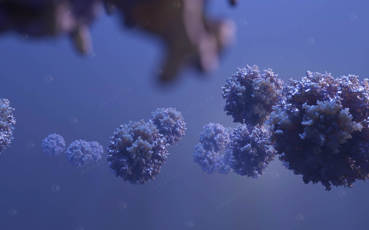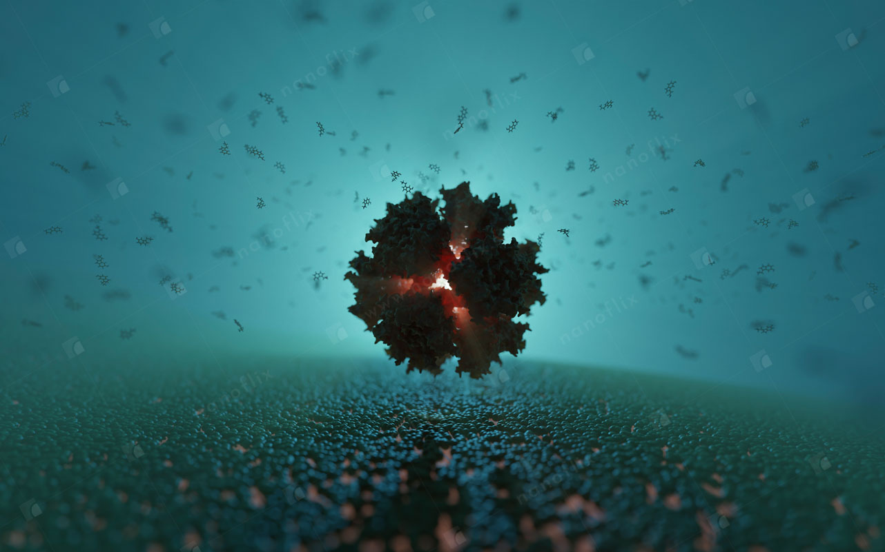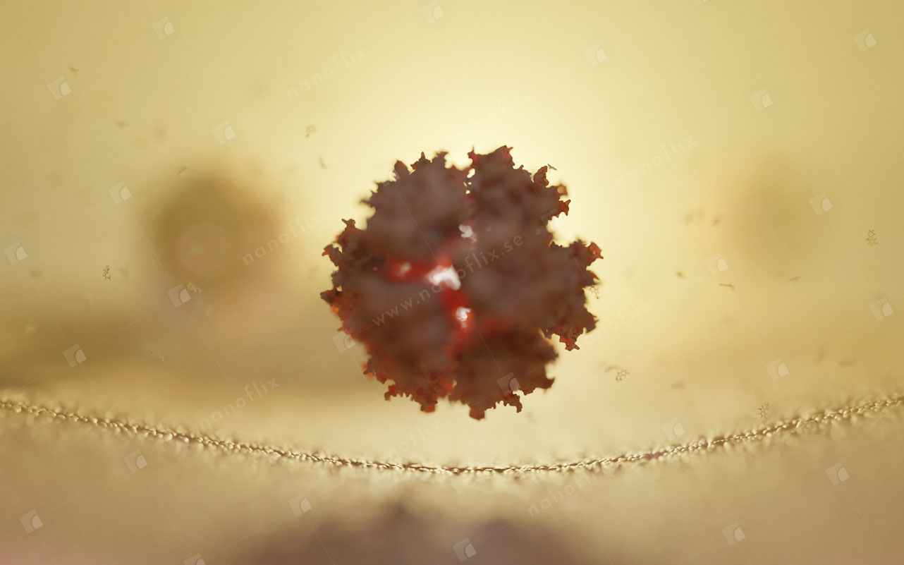 Adenoviruses are medium-sized (90–100 nm) viruses with an icosahedral nucleocapsid containing a double stranded DNA genome. In 2010, the structure of the human adenovirus was solved at the atomic level, making it the largest high-resolution model ever. This last fact alone posed a great challenge even for our high-end hardware and software in the process of handling and rendering this multi-gigabyte colossus.