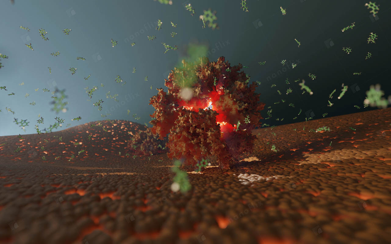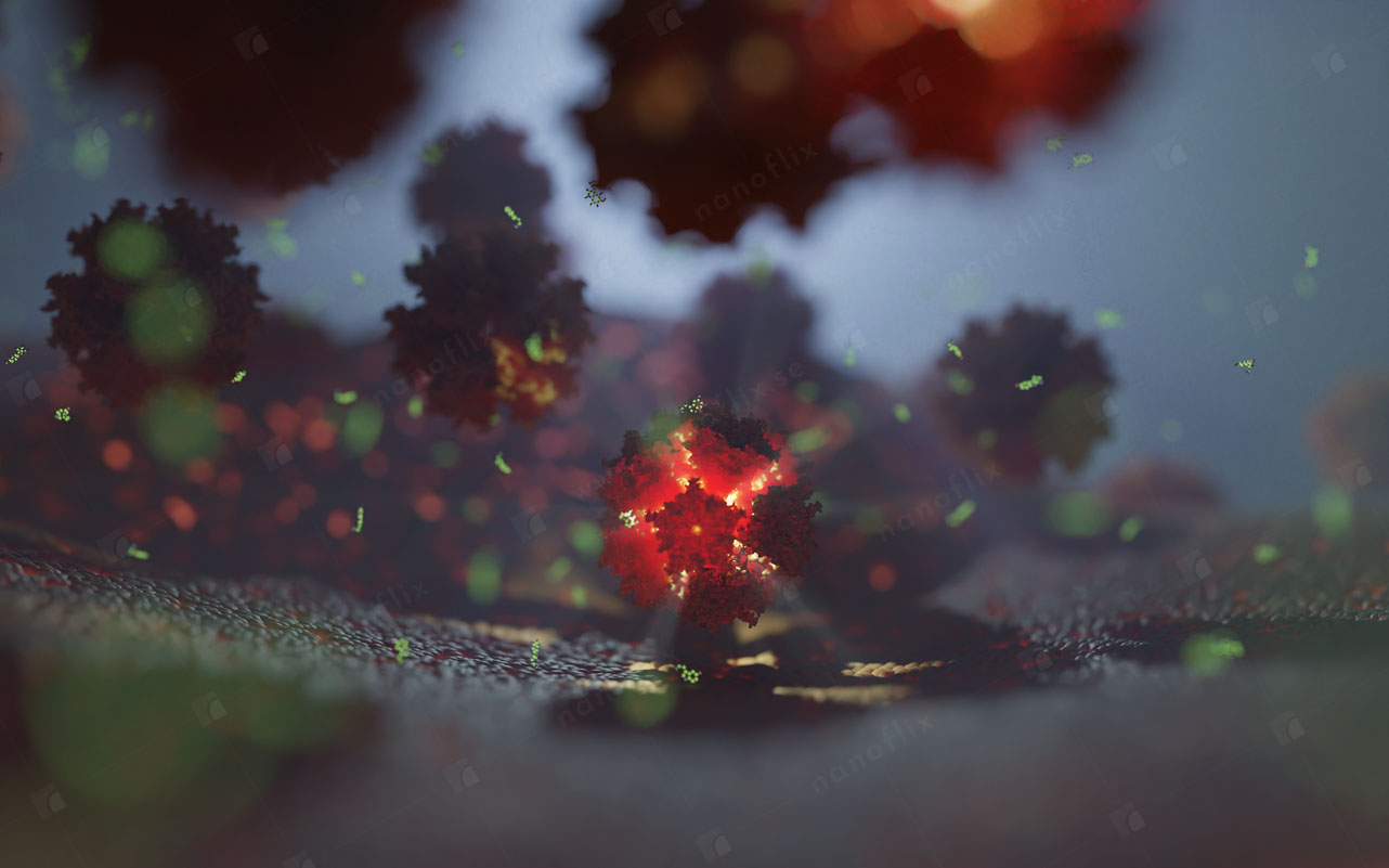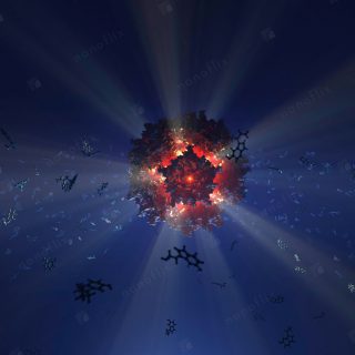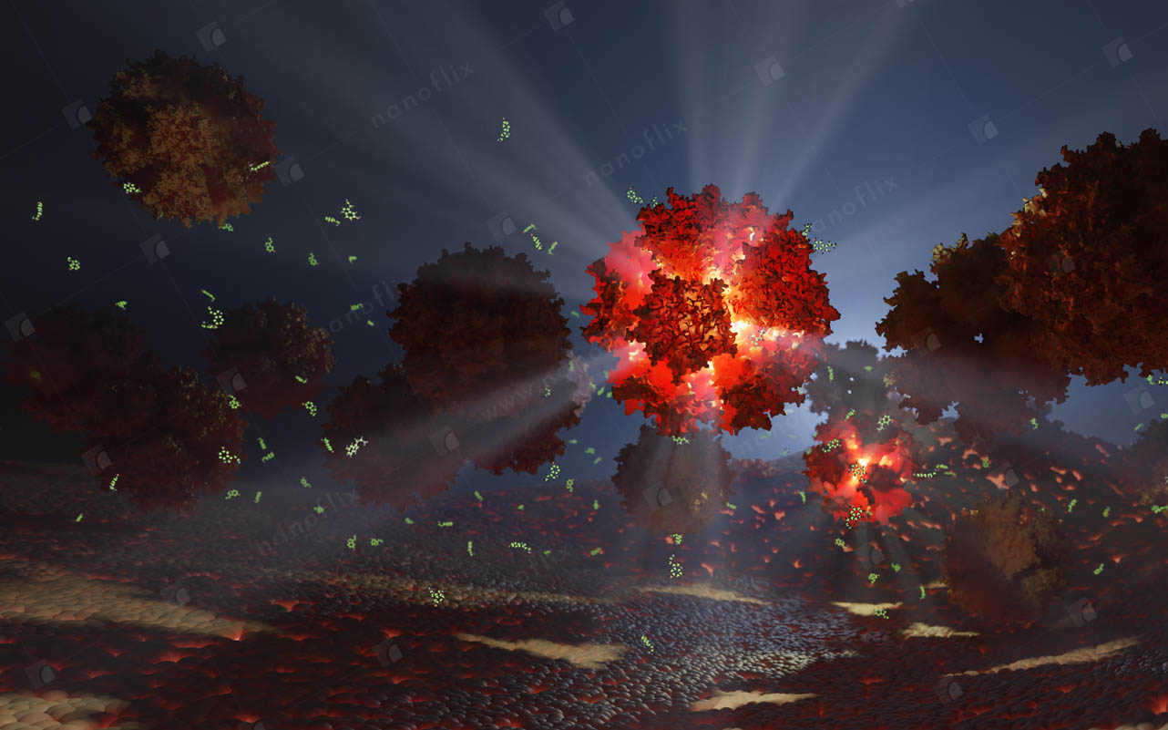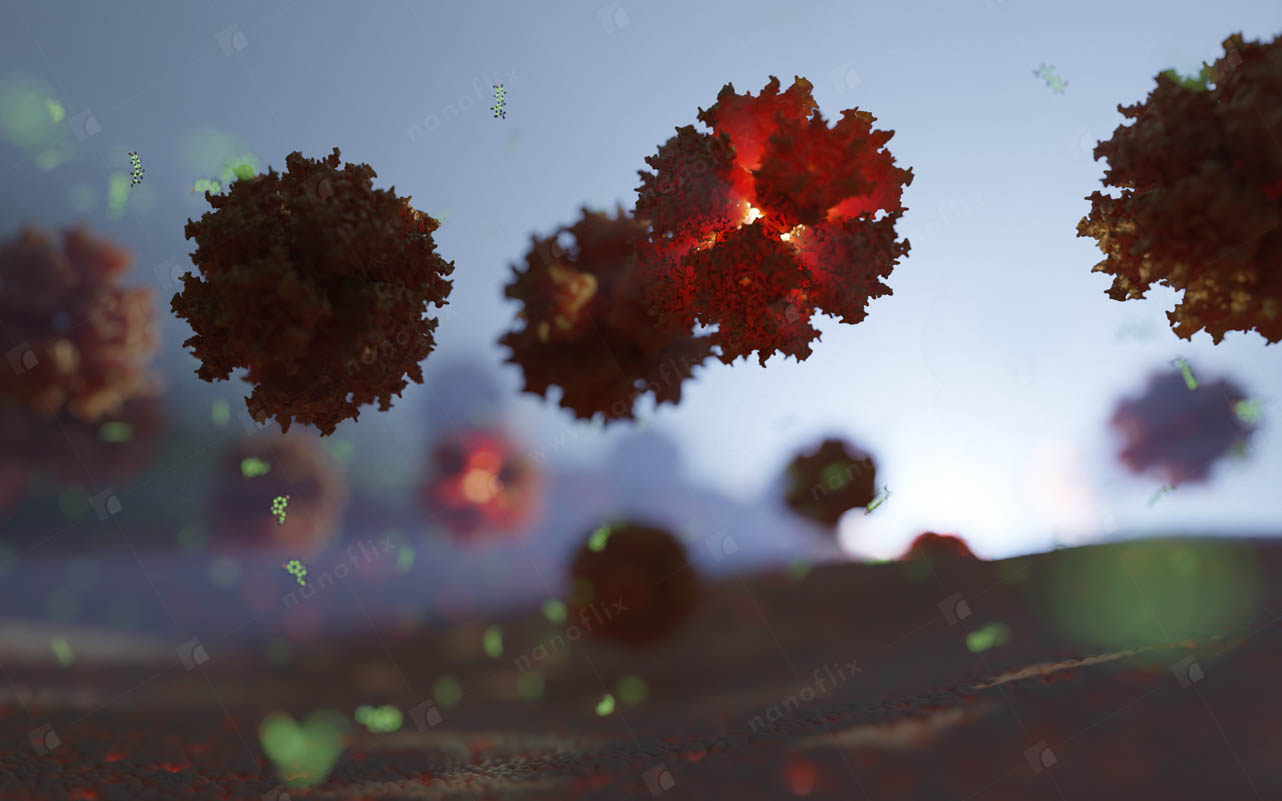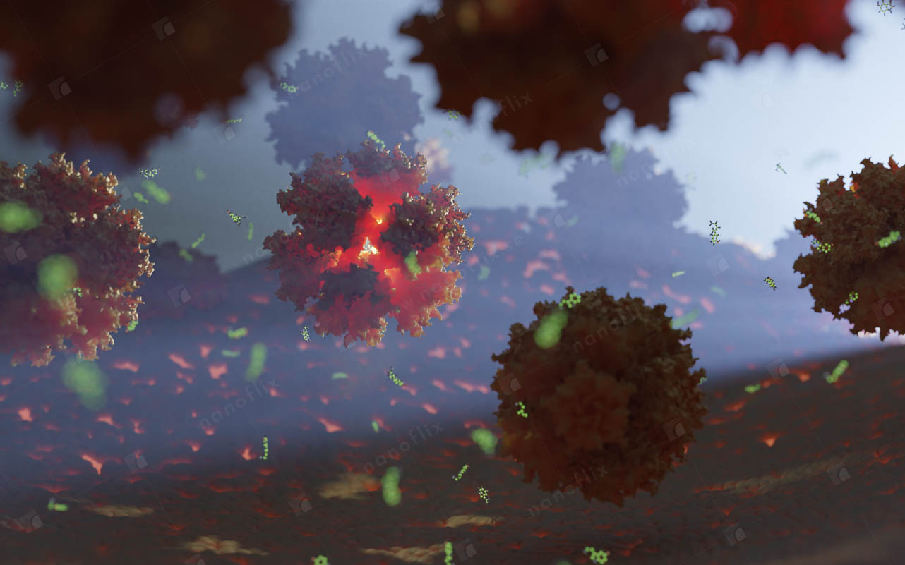 Adenoviruses are medium-sized (90–100 nm) viruses with an icosahedral nucleocapsid containing a double stranded DNA genome. In 2010, the structure of the human adenovirus was solved at the atomic level, making it the largest high-resolution model ever. This last fact alone posed a great challenge even for our high-end hardware and software in the process of handling and rendering this multi-gigabyte colossus.